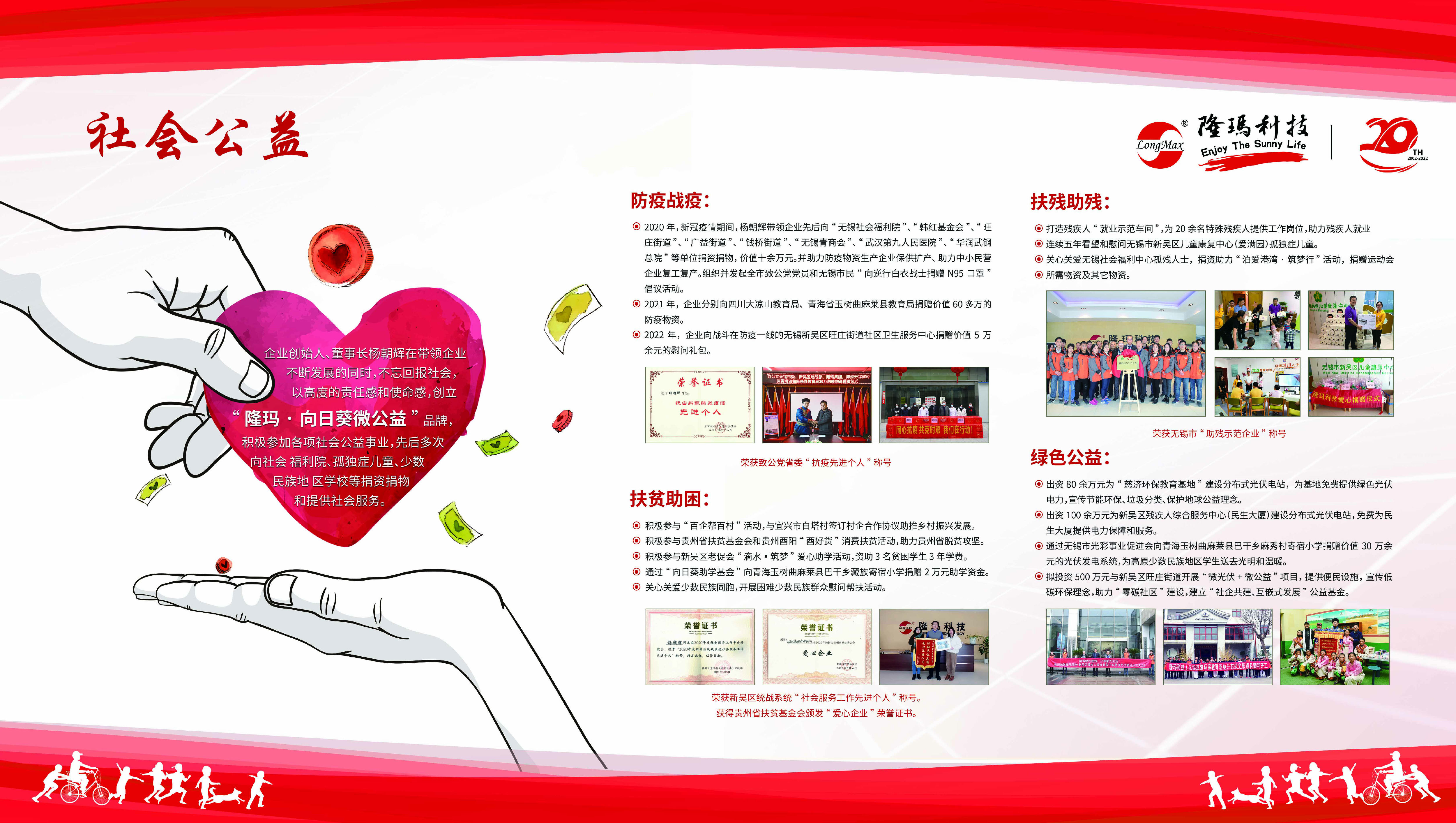 企業(yè)創(chuàng)始人、董事長楊朝輝先生在帶領(lǐng)企業(yè)不斷發(fā)展的同時(shí),不忘回報(bào)社會(huì),以高度的責(zé)任感和使命感,創(chuàng)立“隆瑪---向日葵---微公益”品牌,積極參加防疫戰(zhàn)疫、扶貧助困、扶殘助殘、綠色公益,先后多次向社會(huì)福利院、孤獨(dú)癥兒童、貧困地區(qū)、少數(shù)民族地區(qū)學(xué)校等捐資捐物和提供社會(huì)服務(wù)。公司在慈濟(jì)環(huán)保教育基地和無錫市殘聯(lián)的民生大廈投資建設(shè)光伏發(fā)電項(xiàng)目免費(fèi)使用綠色電能。