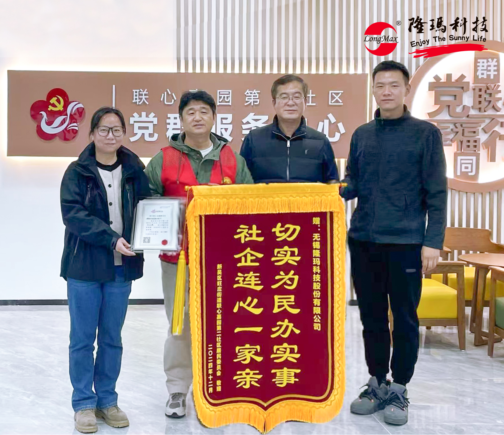 12月 6日,在聯(lián)心嘉園南區(qū)舉行的社會(huì)企業(yè)捐贈(zèng)活動(dòng)儀式上,無錫隆瑪科技捐贈(zèng)的3萬元資金有力地支持了聯(lián)心嘉園社區(qū)樓道微治理工作。此次項(xiàng)目共建不僅是物質(zhì)上的支持,更是社企雙方深化合作的新起點(diǎn)。