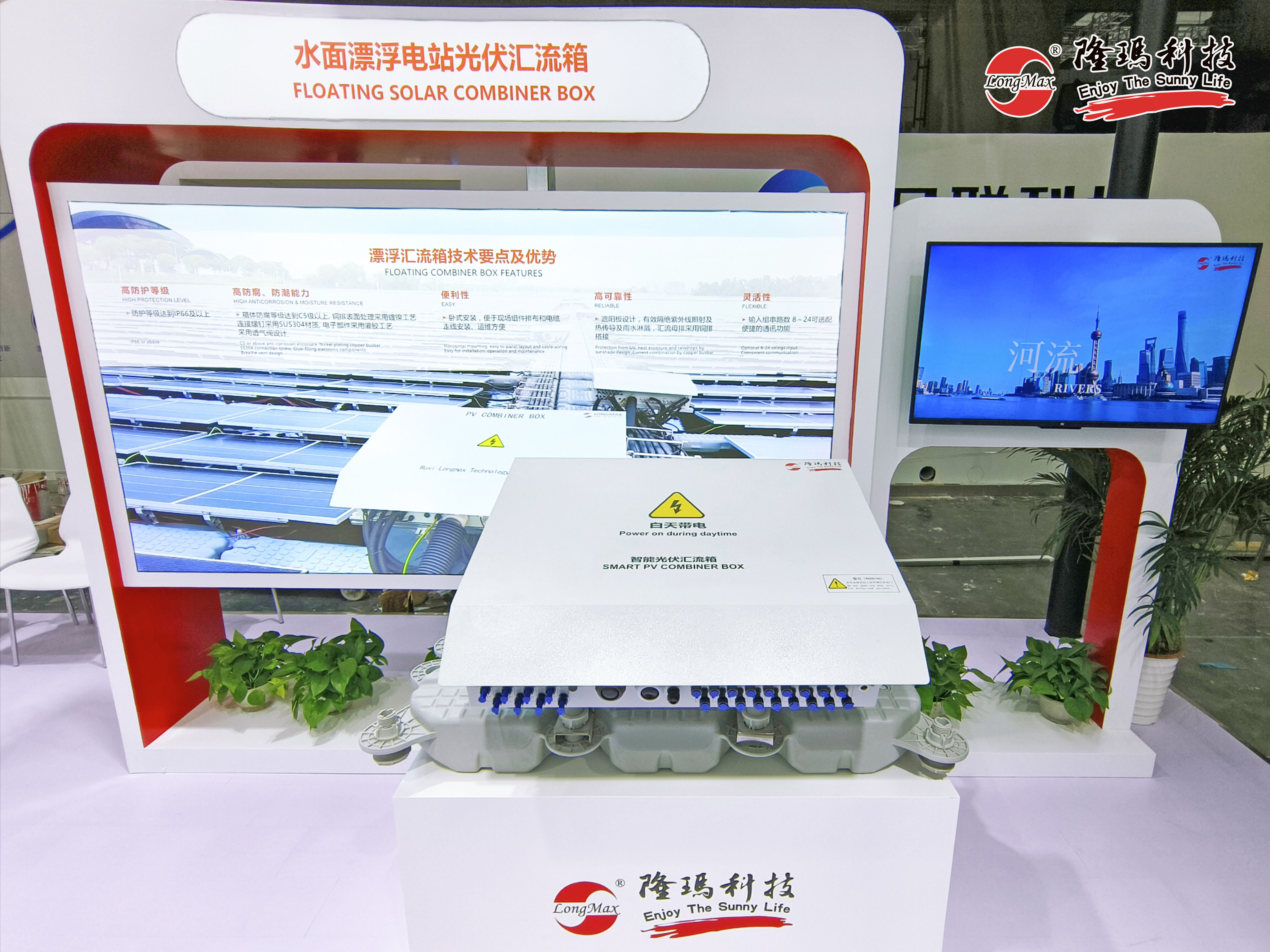 從陸地轉(zhuǎn)戰(zhàn)海洋,隆瑪科技同樣不落于人后。現(xiàn)場展出的另一重量級產(chǎn)品——水面漂浮電站光伏匯流箱,目前已廣泛應(yīng)用于新加坡、菲律賓與印度尼西亞等地的大型水面漂浮式光伏電站中,在海上風(fēng)浪曝曬考驗中表現(xiàn)優(yōu)異。
