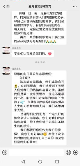 “遠(yuǎn)方少年無(wú)錫游”活動(dòng)不僅是一次簡(jiǎn)單的旅行,更是一次成長(zhǎng)的歷練。它讓少年們?cè)谔剿髦惺斋@了知識(shí),在體驗(yàn)中感受了文化,在分享中增進(jìn)了友誼。在活動(dòng)結(jié)束后,向日葵公益的志愿者老師們收到了少年們?cè)诜党袒疖嚿习l(fā)來(lái)的感謝信,他們用真誠(chéng)質(zhì)樸的語(yǔ)言表達(dá)著感激,訴說(shuō)著未來(lái)。相信這段美好的經(jīng)歷已將希望悄悄播種,將會(huì)在他們?nèi)松猛局虚_出絢爛之花。