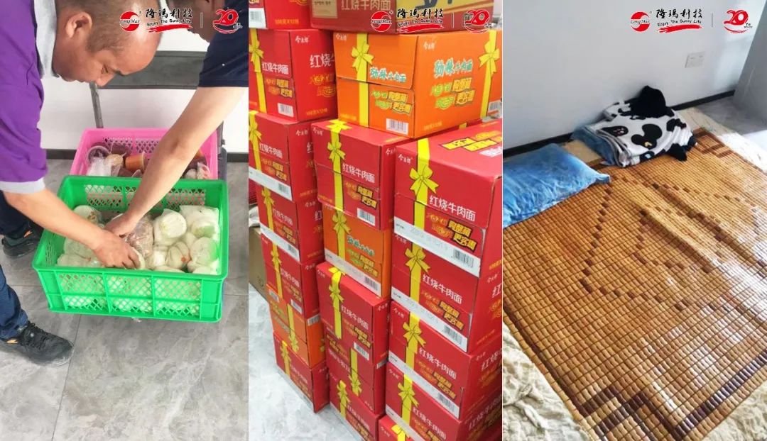 因疫情來得突然給到大家應對的時間短,公司又沒有現(xiàn)成的員工宿舍,當公司駐廠決策通知一發(fā)出來,很多管理人員連夜趕回家把家中的物資收集起來貢獻給公司員工用。