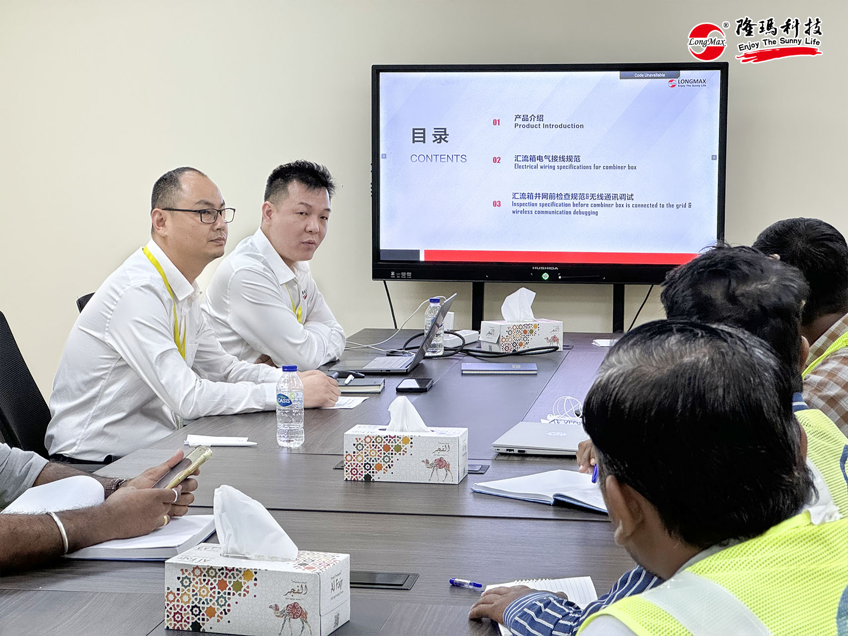 隨后,在持續(xù)高溫的“蒸烤”模式下團(tuán)隊(duì)轉(zhuǎn)戰(zhàn)阿聯(lián)酋迪拜東北部的DEVA VI項(xiàng)目,為當(dāng)?shù)?/span>L&T公司團(tuán)隊(duì)帶來(lái)詳盡的接線規(guī)范培訓(xùn),并針對(duì)當(dāng)?shù)?/span>極端氣候環(huán)境制定了特殊施工維護(hù)方案。