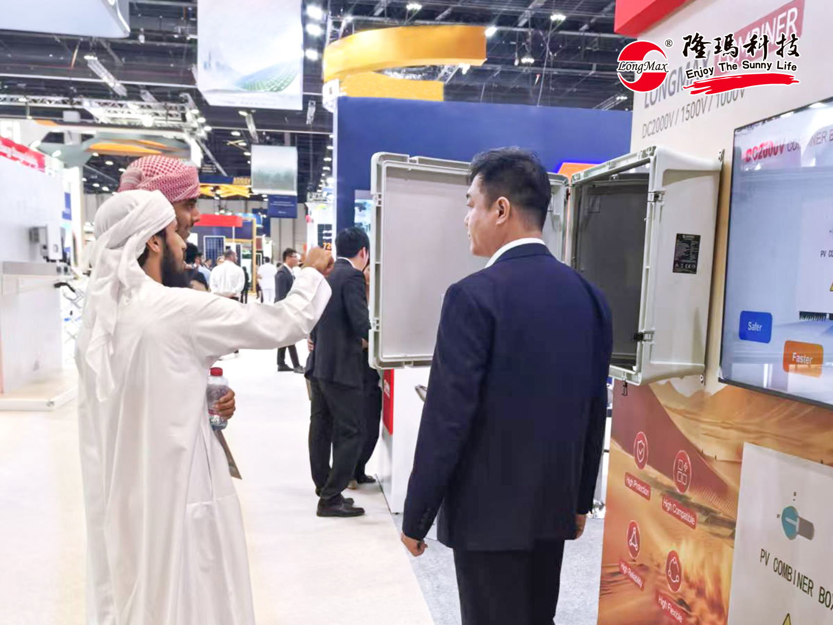 在展會上,隆瑪新一代DC2000V光伏系統(tǒng)智能匯流箱一經(jīng)亮相便以創(chuàng)新設(shè)計與卓越性能牢牢鎖住諸多參觀者的目光,成為現(xiàn)場TOP級“流量明星”。從傳統(tǒng)DC1500V升級到DC2000V,隆瑪DC2000V光伏智能匯流箱在輸入輸出電壓性能上實現(xiàn)了顯著提升,系統(tǒng)傳輸損耗更是銳減至0.5%,從而大幅提高了整個能源系統(tǒng)的轉(zhuǎn)換與傳輸效率。同時,其全新的大箱體設(shè)計,配合多種先進的自動檢測、關(guān)斷功能以及智能通信運維功能,不僅滿足了更高等級的防護要求,更能穩(wěn)健地應(yīng)對沙漠環(huán)境中各種極端惡劣條件。